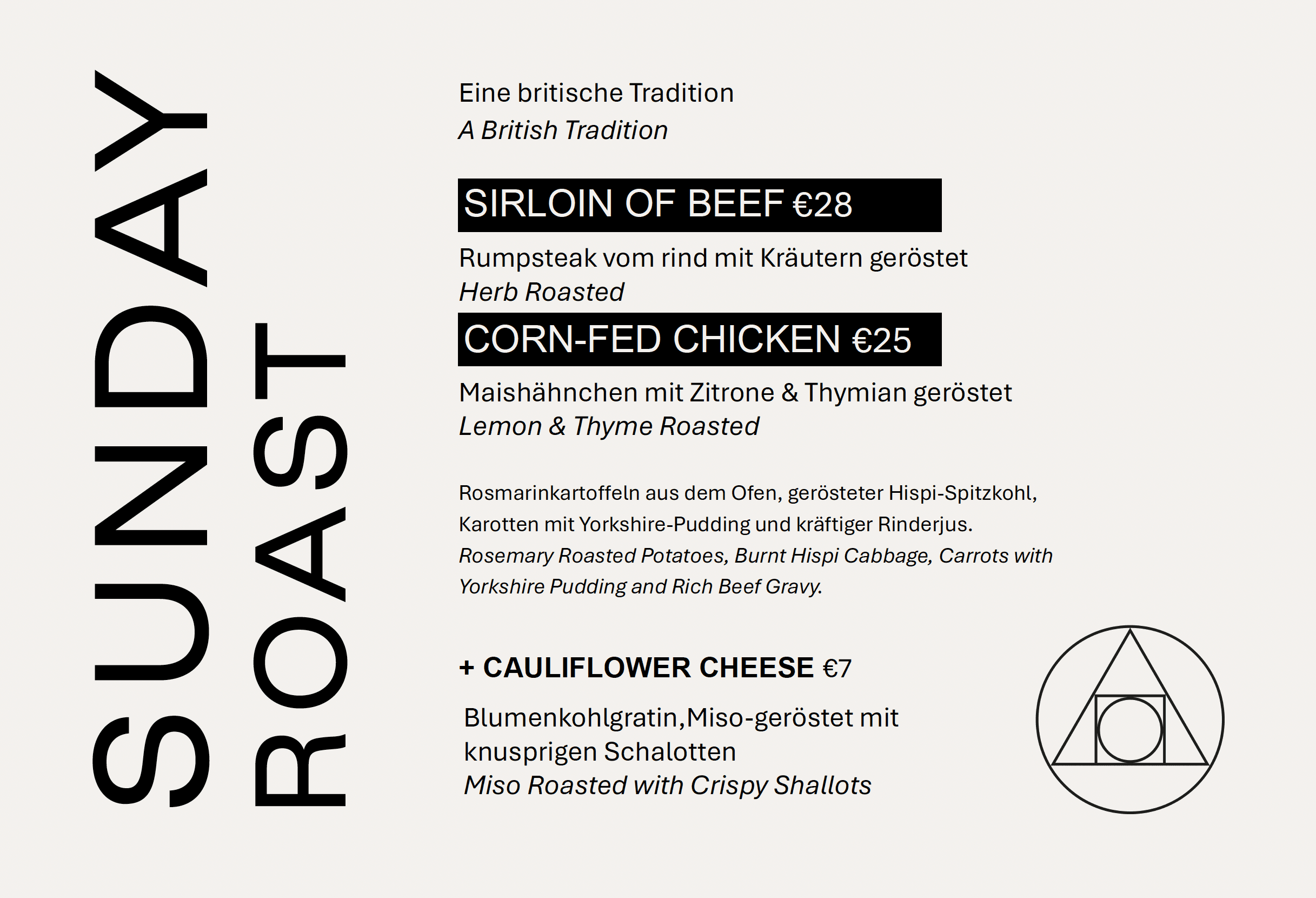 ---------SUNDAY ROASTEVERY SUNDAY FROM 22 MARCHWe’re officially launching our British Sunday Roast. The ultimate comfort feast straight from the UK.We’re talking:• Slow-roasted meats • Crispy-on-the-outside, fluffy-on-the-inside roast potatoes • Giant Yorkshire puddings • Lashings of rich gravy • All the proper trimmingsWhether you’re a homesick Brit, a curious Berliner or just someone who appreciates a serious plate of food — this is your new Sunday ritual.